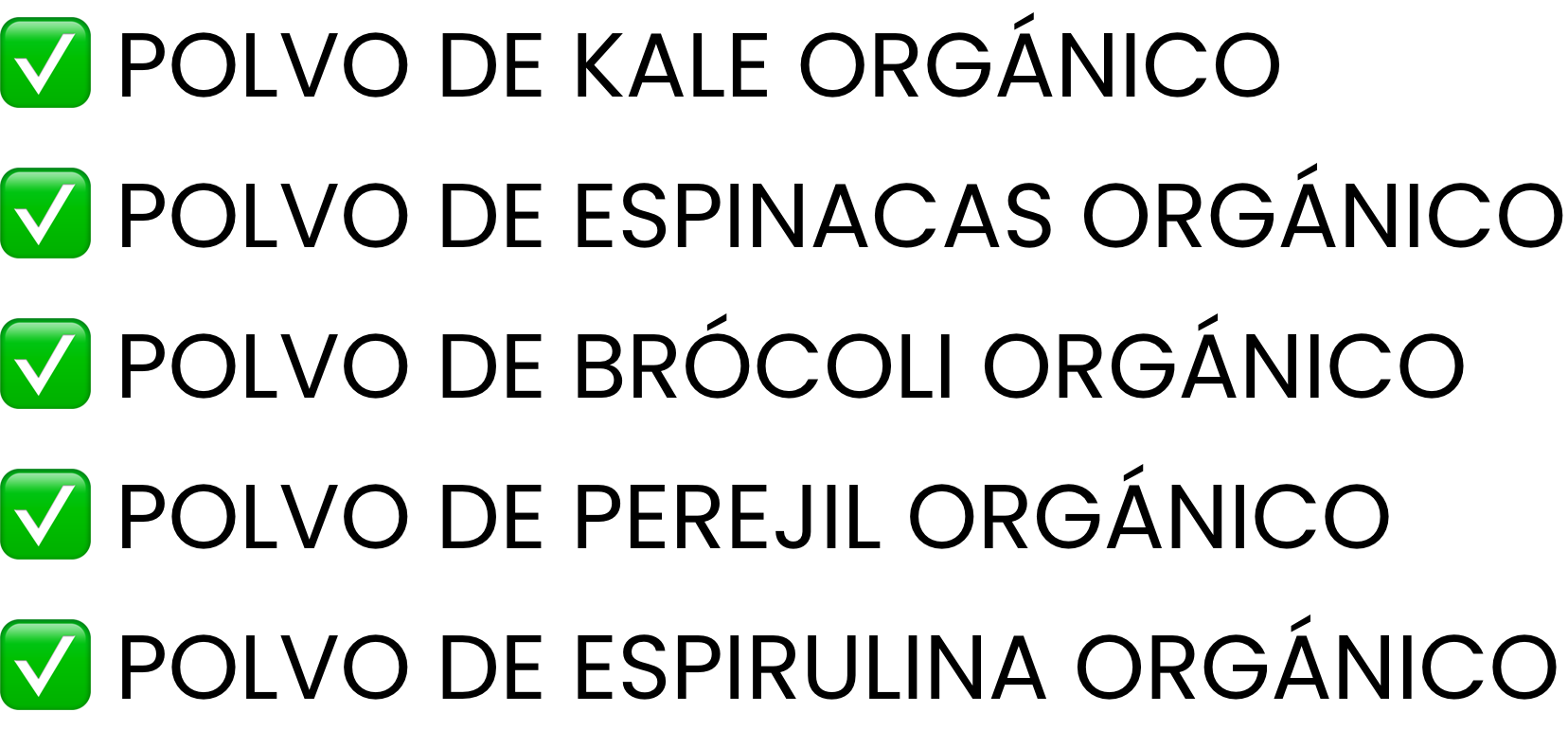 Cada porción de ONE SOL Greens contiene una poderosa dosis de 5000 mg de nuestra mezcla Super Greens. ¡Esto asegura que su cuerpo obtenga todos los nutrientes que necesita para seguir adelante todos los días! ¿Mencionamos que solo usamos verduras orgánicas también? Aquí hay algunas que puede encontrar en cada cucharada de Greens: